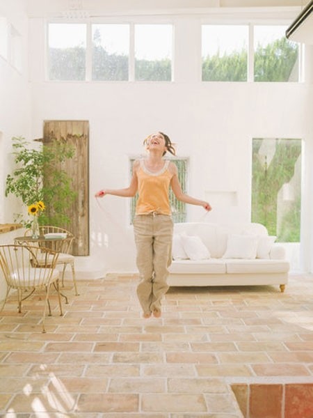 跳绳取材方便,方法简单,且不受活动场地、气候条件的限制,还可自行调节运动量。除此之外,跳绳还兼有放松情绪的积极作用。对女性来说,冬天多跳绳好处多多。