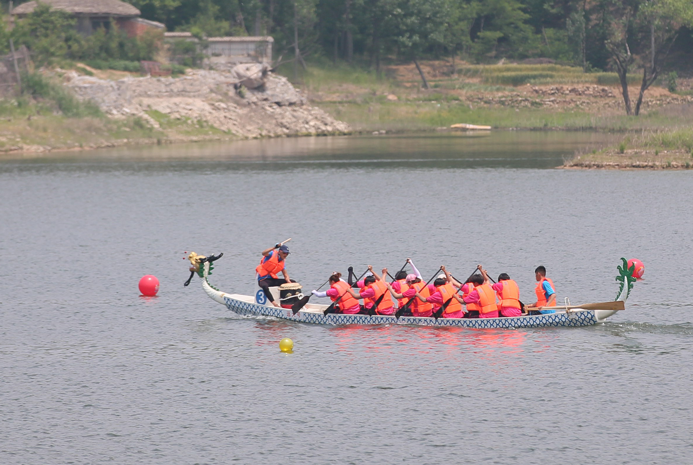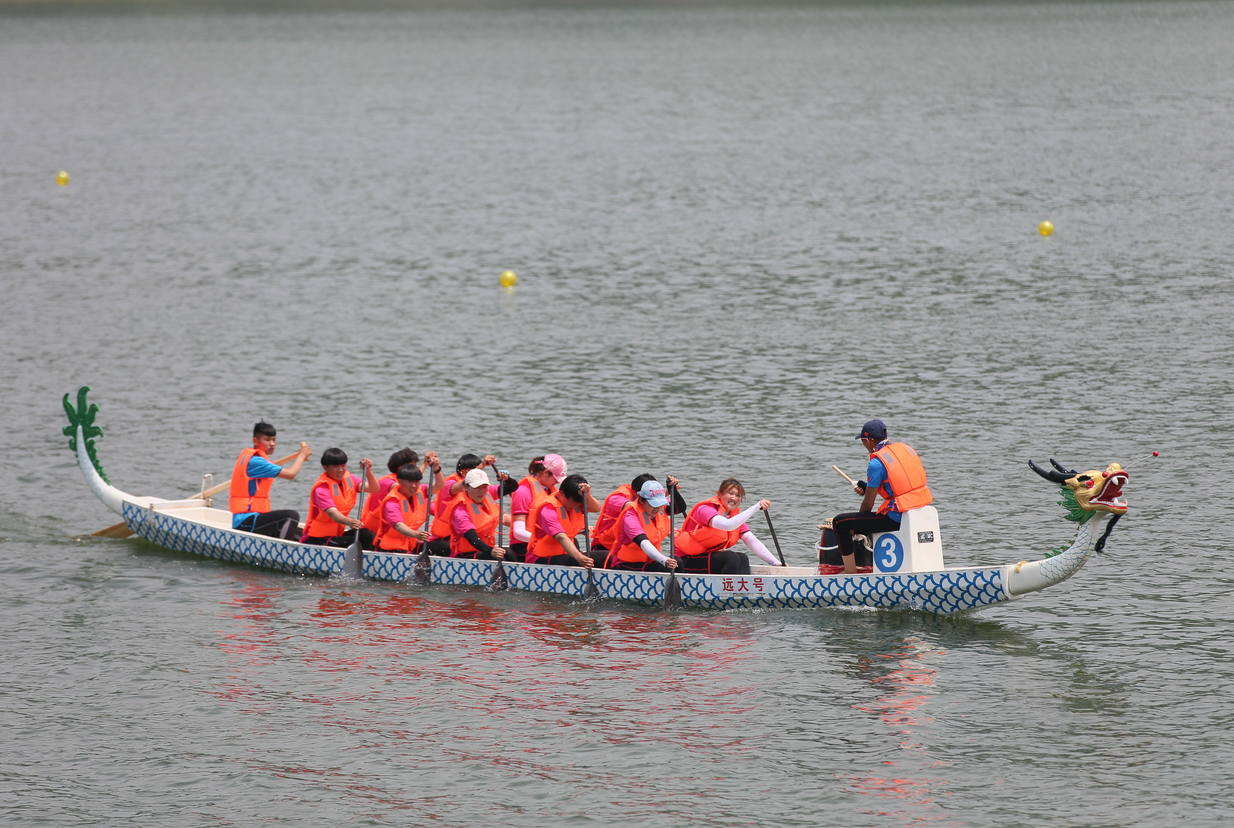 在女子500米直道竞速比赛中济宁队首先冲过终点 济宁市女子代表队在200米直道竞速赛中,发挥失常,获得第四名,在女子500米直道竞速赛中,调整了舵手,队员们铆足了劲,没再给对手任何机会,只见运动员们奋力挥动着胳膊,船桨在水里上下翻飞,推动龙舟疾驰在松月湖上,激起白绢般的水花,在中途已经确立了领先地位,最终以超过24.75秒的优势率先冲线,夺得该项比赛的第一名,体现了孔孟之乡的拼搏进取、奋勇直前的精神。岸边欢呼声、加油声震耳欲聋,热烈的比赛氛围把整个松月湖都“煮沸”了。