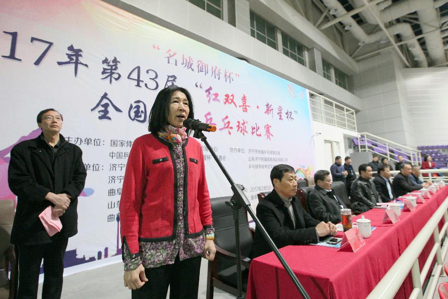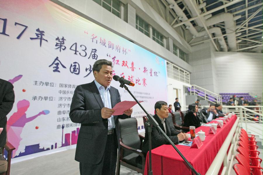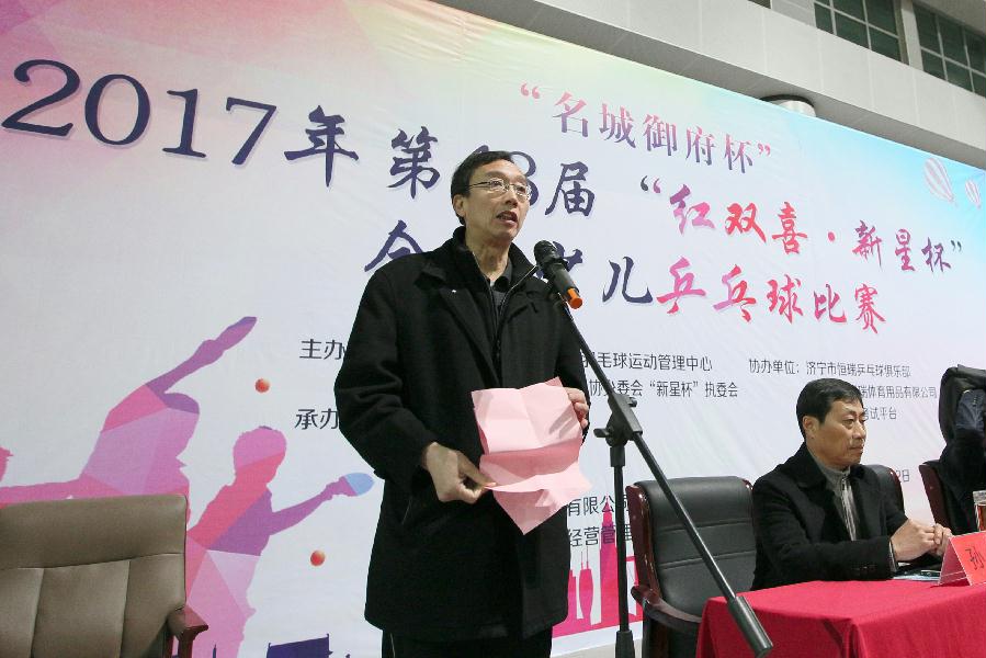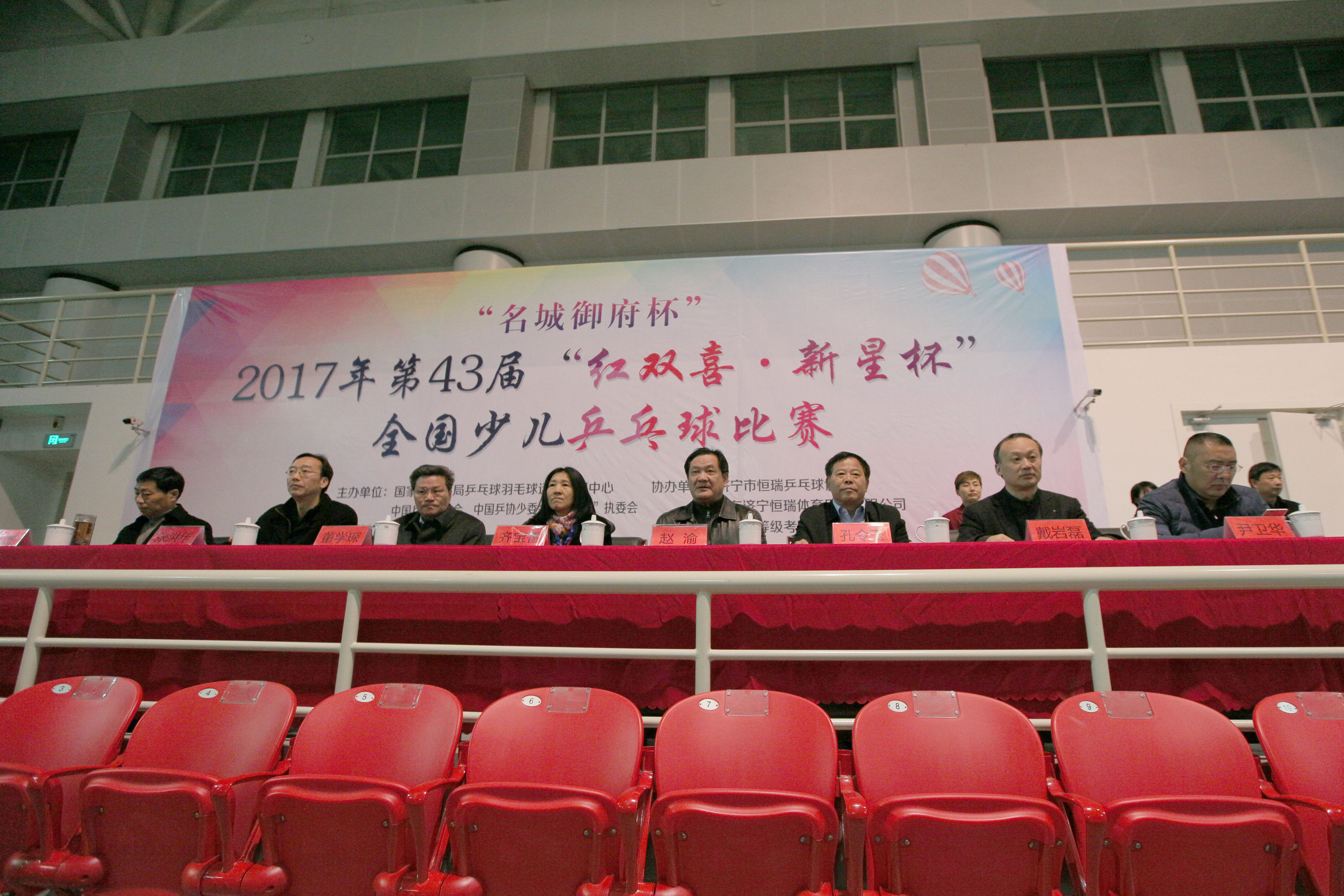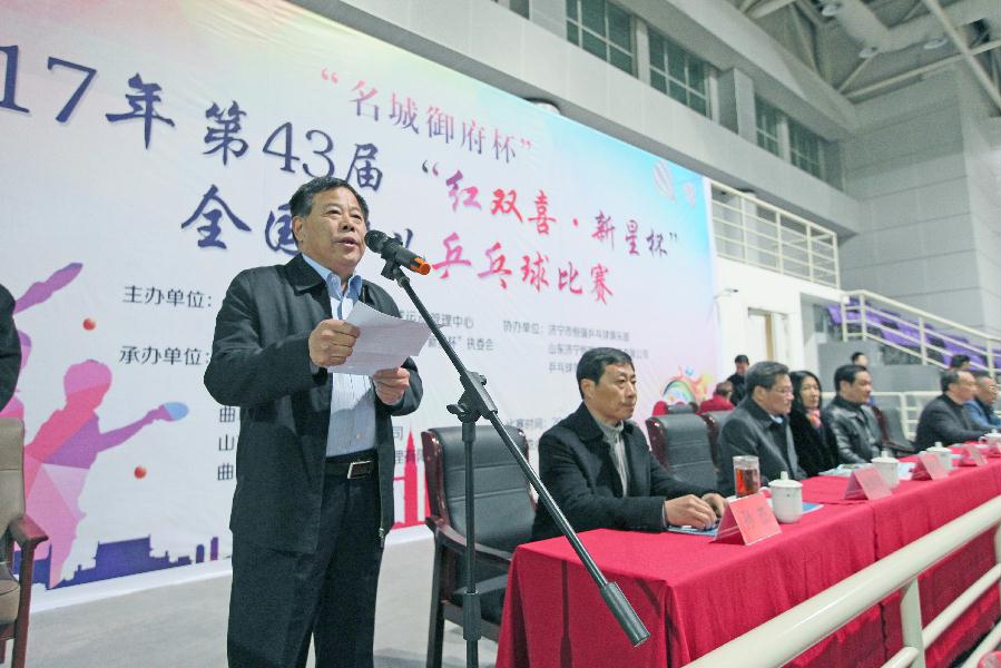 2月7日,“名城御府杯”2017年第43届“新星杯”全国少儿乒乓球比赛在曲阜市新体育馆拉开战幕,来自全国各地59支代表队的千余名9至15岁的小运动员们,将在为期6天的赛事里进行激烈的角逐。国家体育总局乒羽管理中心官员齐宝香,中国乒协少委会新星杯执委会主任赵渝,济宁市体育局局长董学琛,曲阜市政协主席孔令玉,济宁市体育局党组成员、市体育总会办公室主任张洪年,济宁市乒乓球协会会长戴岩磊,曲阜市教体局副局长、体育活动中心主任孙杰,山东名城建设集团有限公司董事长尹卫华出席开幕式。齐宝香宣布比赛开始,董学琛在开幕式讲话,孔令玉致欢迎词,张洪年主持开幕式。
