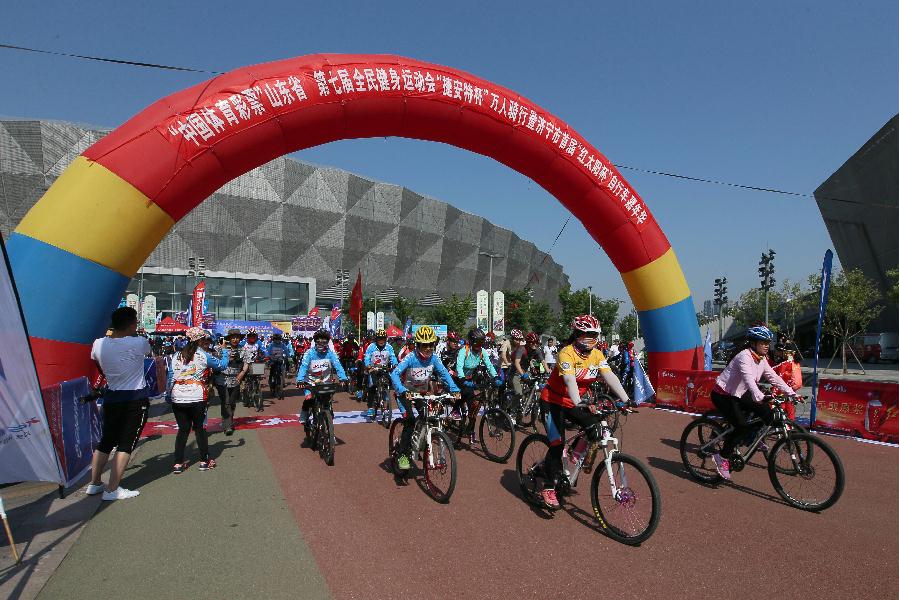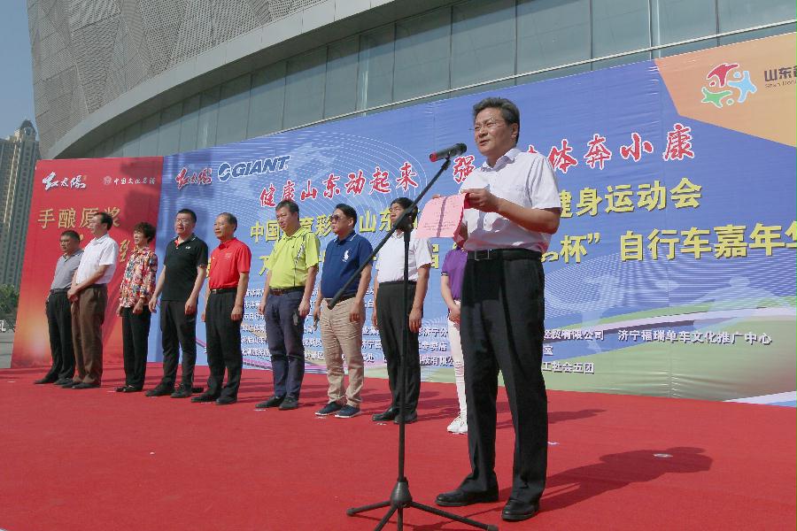 5月28日上午,随着响亮的发令枪声,近1600名骑游爱好者在济宁市体育中心分组陆续出发,开启一场盛大的骑游太白湖盛宴。以“健康山东动起来,强身健体奔小康”为主题的“中国体育彩票”山东省第七届全民健身运动会“捷安特杯”万人骑行开幕式暨济宁市首届“红太阳杯”自行车嘉年华活动在济宁太白湖新区隆重举行,从此拉开了2017年山东省第七届全民健身运动会万人骑行的序幕。山东省体育局党组成员、副局长徐大义宣布万人骑行开幕;济宁市体育局局长董学琛主持开幕式;山东省射击自行车运动中心常务副主任、省自行车运动协会秘书长李大峰致开幕词;山东省射击自行车运动中心副主任、省自行车运动协会副主席张崇文,济宁市体育局副局长邵波鸣枪发令;山东红太阳酒业集团副总经理楚贵远致辞;济宁精骐车业公司总经理李静宣读济宁市自行车运动协会文明骑行倡议书;济宁市总工会党组成员、副主席李慧敏,市体育局党组成员、体育总会办公室主任张洪年,太白湖新区管委会副主任王利生出席开幕式。